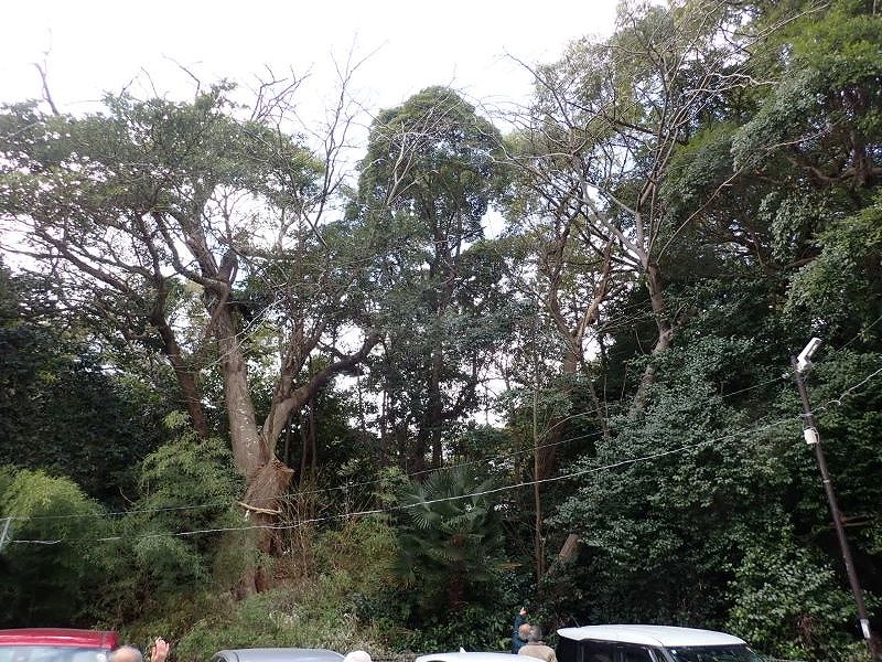 依頼のあったイチイガシは相野谷神社境内にあり、みえの樹木百選によると樹高35m・幹周4.5mと大きな樹体である。根は四方に伸び根元付近にも大きな腐朽などは見受けられないことから根元からの倒木の恐れは少ないと推測された。ロープワークによる樹体上部の確認をしたところ過去の剪定・折損が原因と思われる腐朽開口部があり、その付近から斜め上方に伸びる大枝が将来的には腐朽の進行などにより折損する危険が推測された。直近の対策として大枝の剪定による重量の軽減を、長期的対策として定期的な剪定による樹体の成長抑制と腐朽の進行の確認を提案した。 |