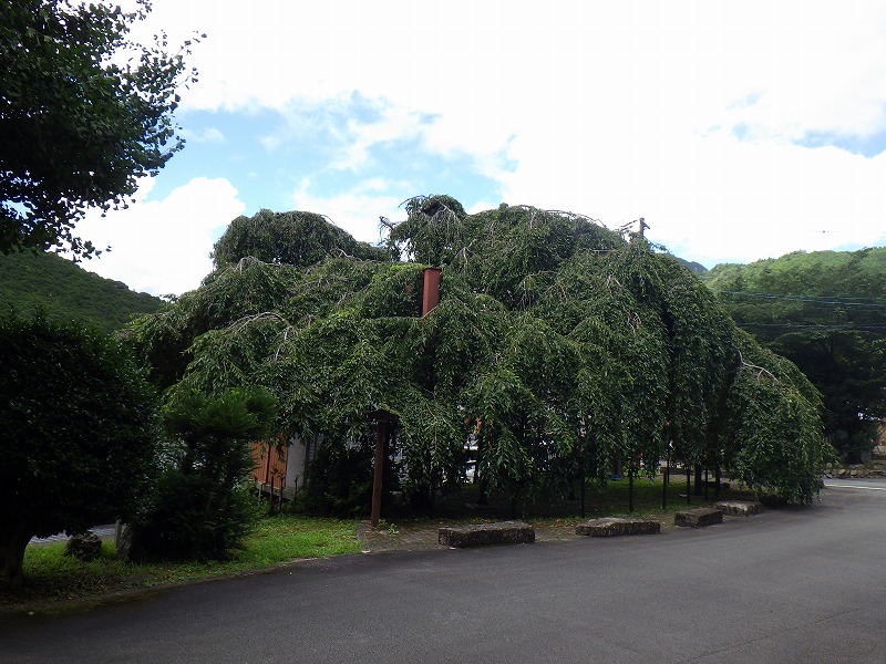 旧・稲葉小学校の敷地内植栽されている枝垂れ桜とヤマザクラと思われる桜で、枝垂れ桜は樹高8mで枝垂れた枝を伸ばして優美な樹形を呈していたが、西側から拡大しているモウソウチクの被圧により幹は東側に傾き、樹冠も偏っている。このため、モウソウチク林の伐採、根元周辺土壌を破砕して通気性、透水性の改善が必要である。ヤマザクラは、モウソウチクに完全に取り込まれ樹形が大きく崩れており、樹勢の回復は困難と考えらるため、放置するか伐採することが妥当。